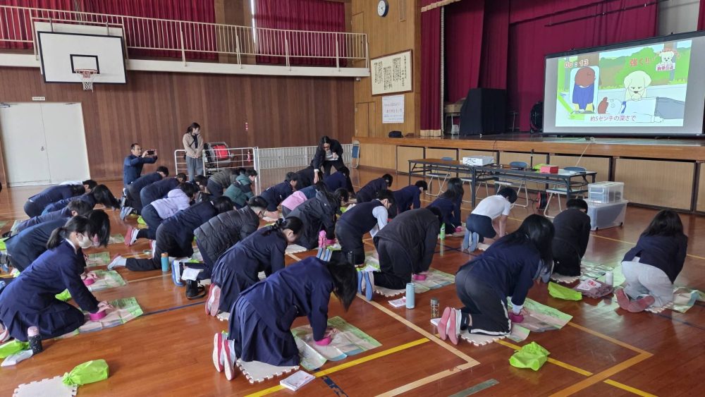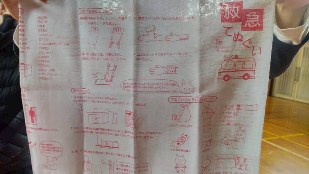 また、PTAの方々が児童に「救急手ぬぐい」をいう怪我や心肺停止時にどうしたら良いかを記している手ぬぐいを配布されており、学校だけでなく保護者の方たちも一体となって児童やその周りの方々の安全を守ろうとされている取り組みに、スタッフ一同深く感銘を受けました。
